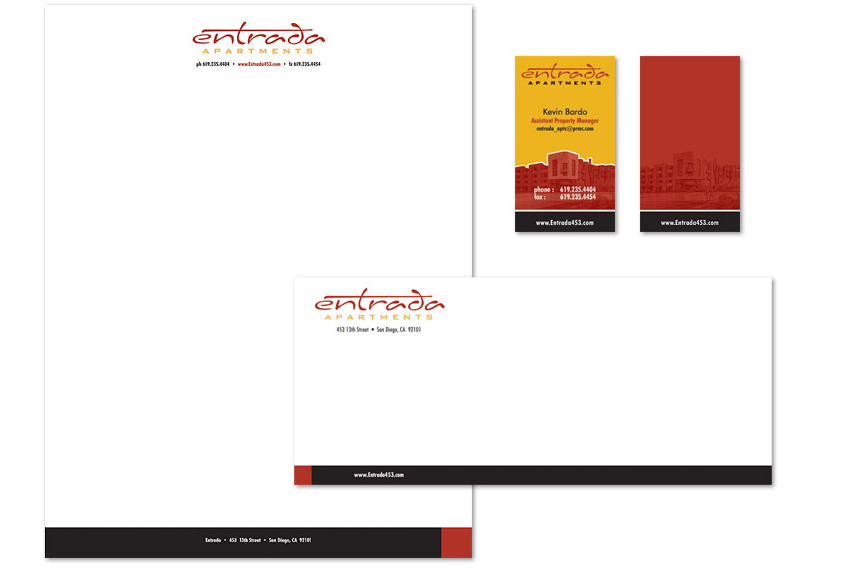 Entrada Apartments NEW – Entrada Logo Stationery Package: Letterhead, Business Card and Envelope Entrada Booklet Mug, Baseball Cap and Polo Shirts Maintenance Van Web and Print Ads Entrada Logo Concepts