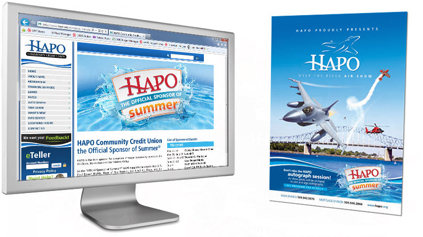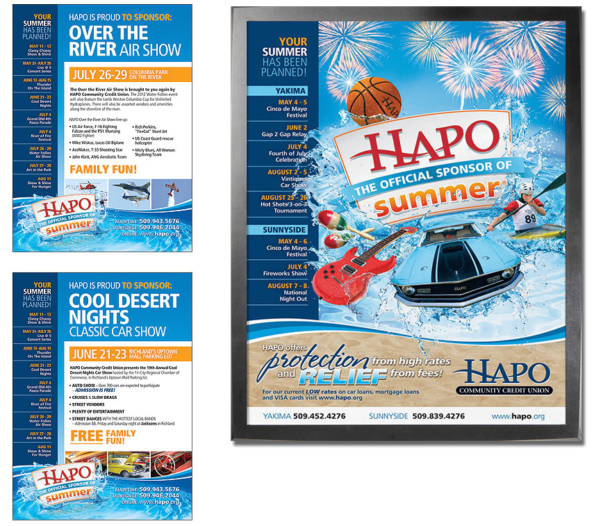 2012 Summer Events Lobby Posters, Tabletop Displays, Water Bottle and Rub-on Tattoo In-Branch TV Screens, Outdoor Signs and 50′ LED Billboard Website Landing Page and Water Follies Program Ads Tri-City Herald Ads and Lobby Posters for Yakima/Sunnyside Branches