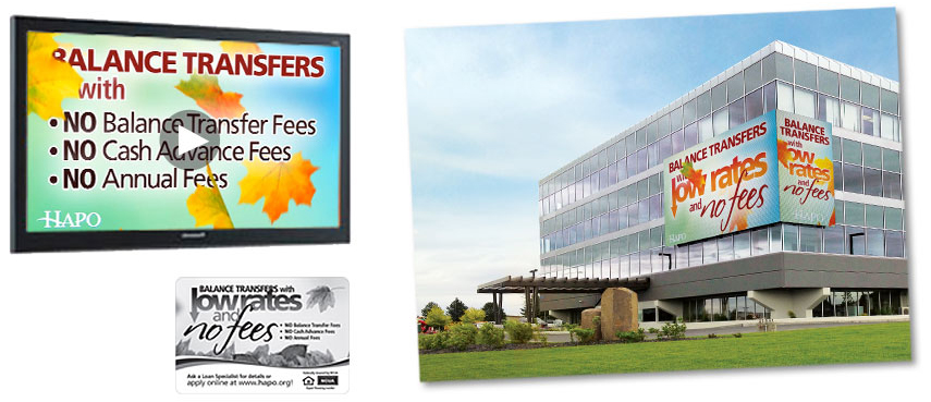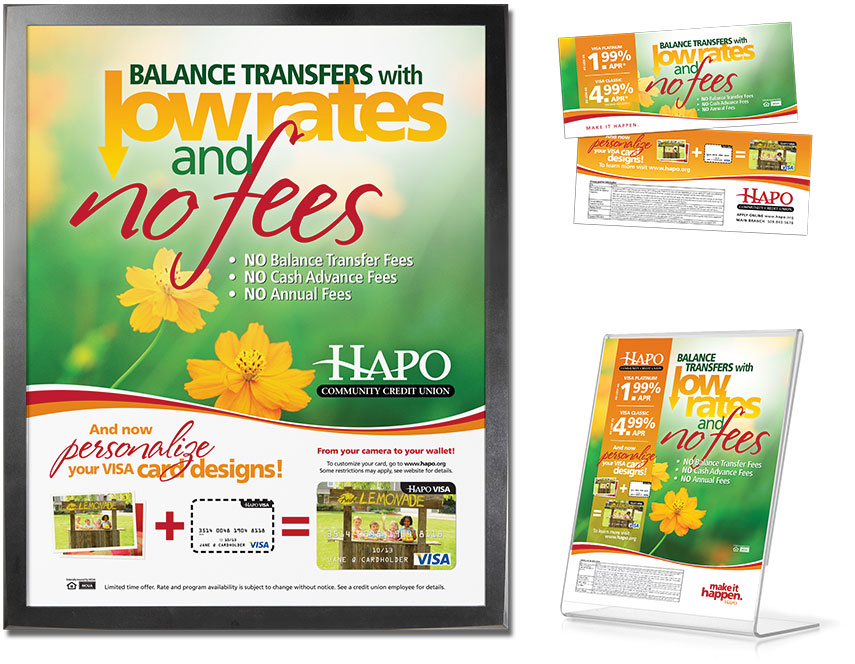VISA Balance Transfer “Fall” Lobby Posters, Tabletop Displays, and Teller Handouts In-Branch TV Screens, Statement Graphic, and 50′ LED Billboard VISA Balance Transfer “Spring” Lobby Posters, Tabletop Displays, and Teller Handouts
