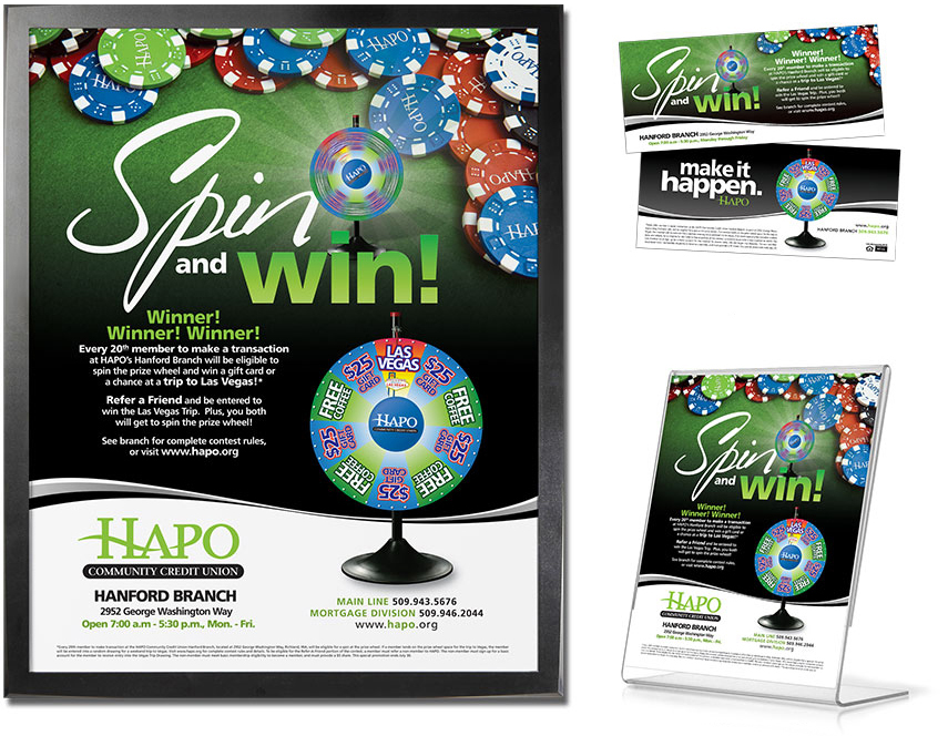 Las Vegas Trip “Spin and Win” Lobby Posters, Tabletop Displays and Teller Handouts Referral Cards, Promo Buttons, Website Slider and Spinning Prize Wheel
