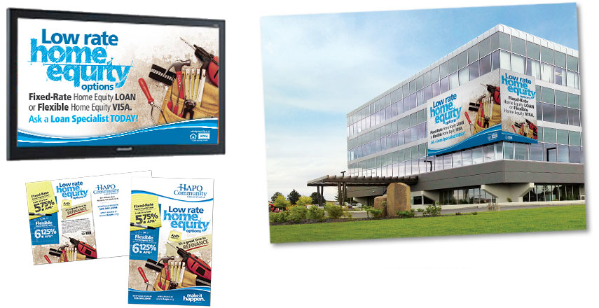 Home Equity Loan “Tools” Lobby Posters, Tabletop Displays and Teller Handouts In-Branch TV Screens, Postcards and 50′ LED Billboard
