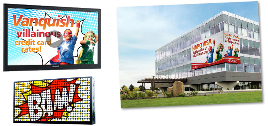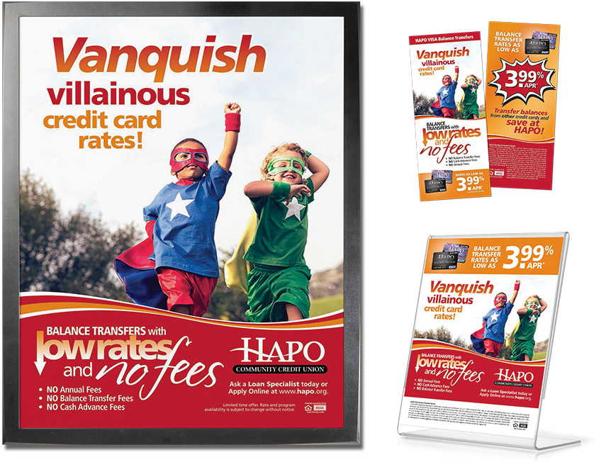 VISA Balance Transfer “Super Heroes” Lobby Posters, Tabletop Displays and Teller Handouts In-Branch TV Screens, Outdoor Screens and 50′ LED Billboard