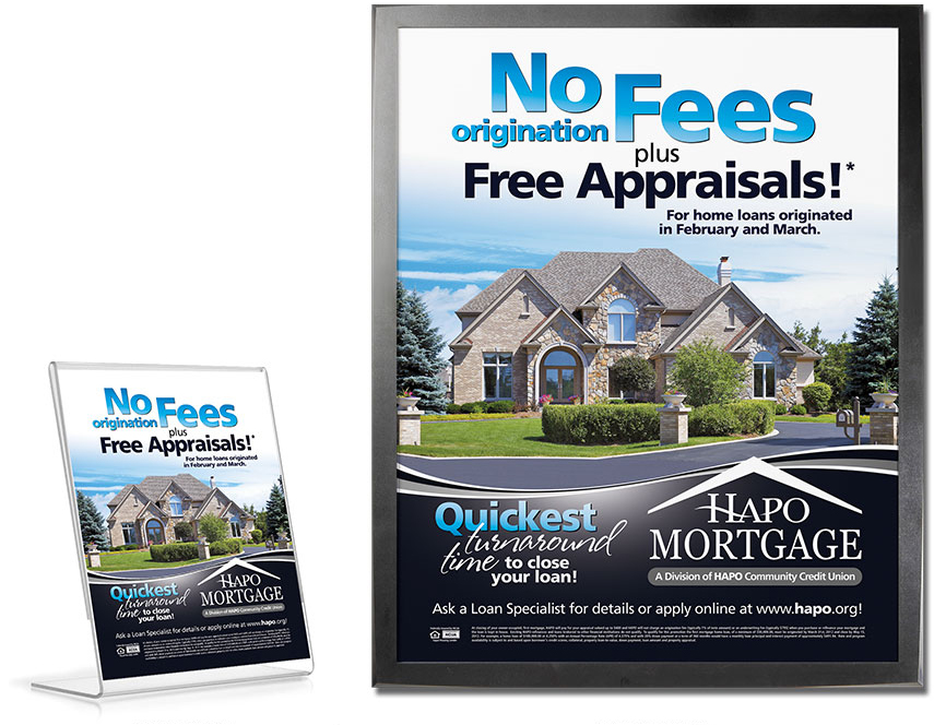 “No Fees” Home Loans Lobby Posters, Tabletop Displays, and Teller Handouts Tabletop Displays and Lobby Posters Website Landing Page and Print Ads
